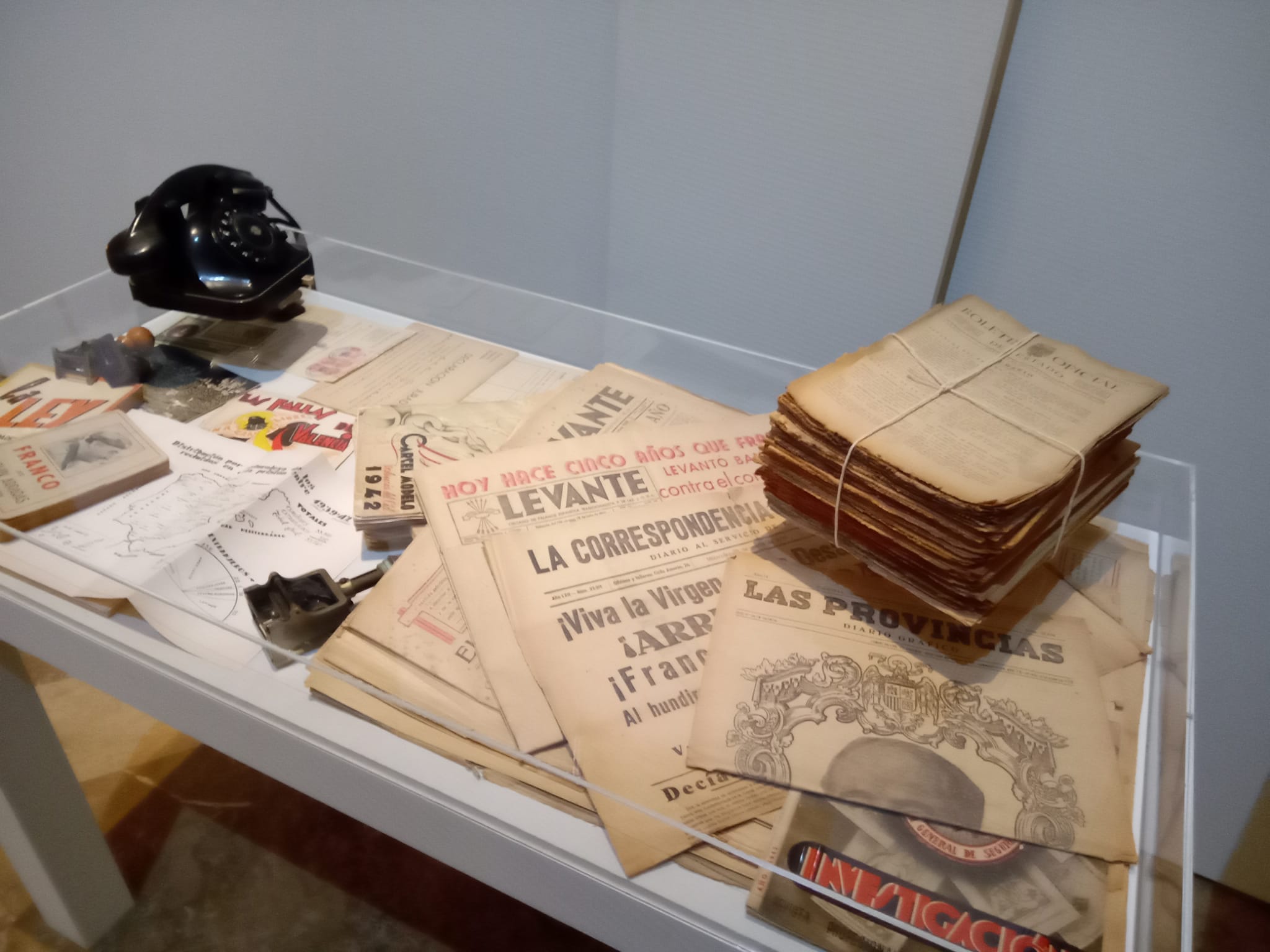 Para que nadie se lleve a engaño, nada más entrar en la sala, entrar dentro y no poder salir fuera, reciben las fotos canónicas de los lideres vencedores, esas que junto al crucifijo estaban en todos los colegios y centros públicos. Una pila de periódicos amarillentos del régimen, y los legajos carcomidos por el tiempo completan el lúgubre panorama.