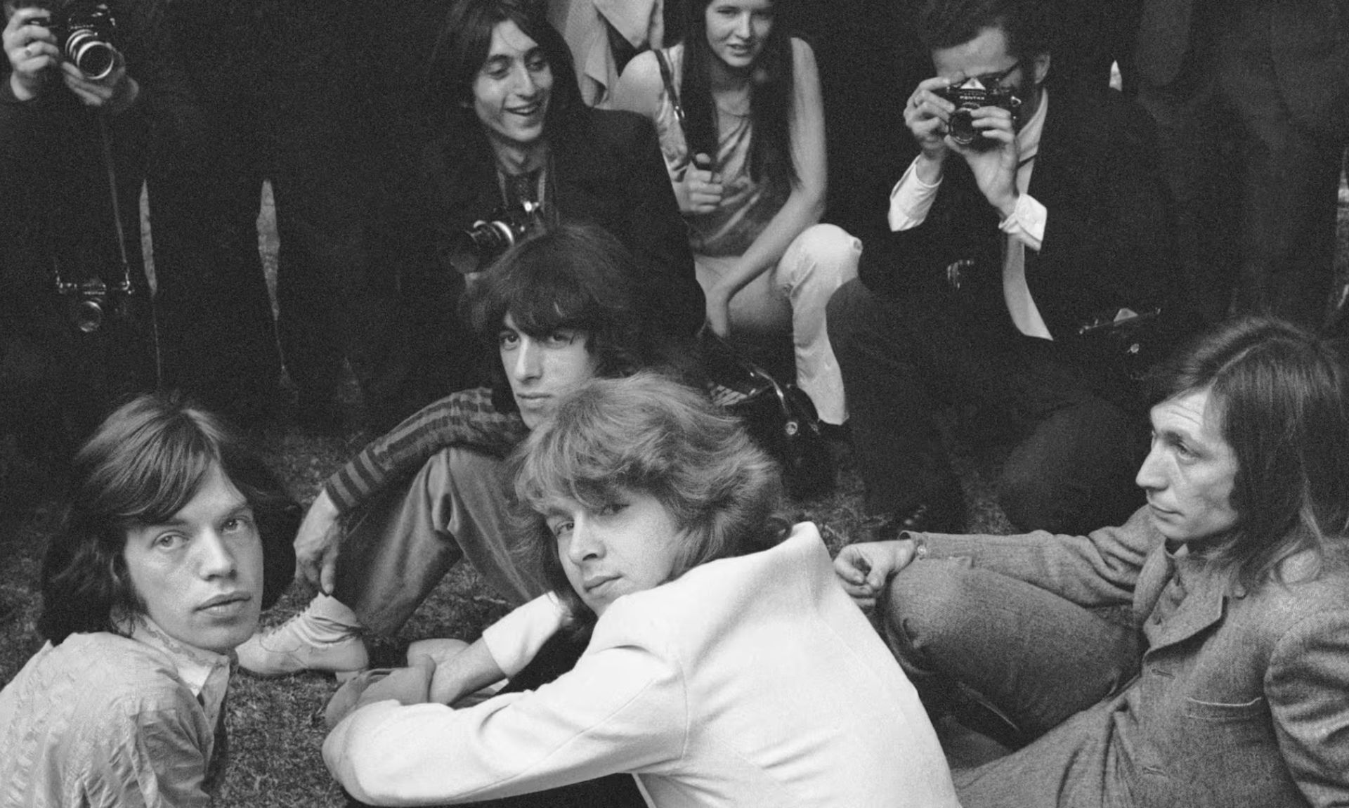 Los Rolling Stones, en una sesión fotográfica en Hyde Park con el nuevo guitarrista Mick Taylor, que reemplazó a Brian Jones, el 12 de junio de 1969. De izquierda a derecha, Mick Jagger, Bill Wyman, Mick Jones, Keith Richards, al frente, y Charlie Watts. / J. Wilds.