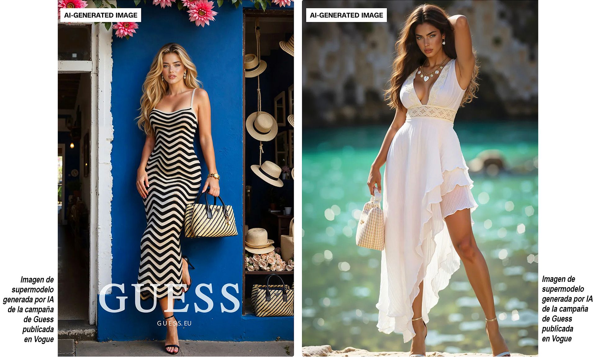 Es curioso, como afirma la especialista Kati Chitrakorn de CNN Style que lo que ha hecho viral el ejemplar de agosto de 2025 no es la portada con famosa actriz y celebrity Anne Hathaway, que aparece en él tras el rodaje de la secuela de «El diablo viste de Prada», si no que ha ocurrido mucho más por los anuncios en la revista de la firma de ropa californiana Guess, que publican imágenes de perfectas modelos inexistentes generadas por inteligencia artificial. La segunda foto de este artículo es una imagen que muchas lectoras y lectores no distinguirán de una imagen real. A simple vista, nada parece inusual: mujer caucásica con cabello rubio ondulado, mejillas sonrojadas, dientes perfectos y amplia sonrisa que luce un vestido largo de rayas con un bolso de asa a juego.