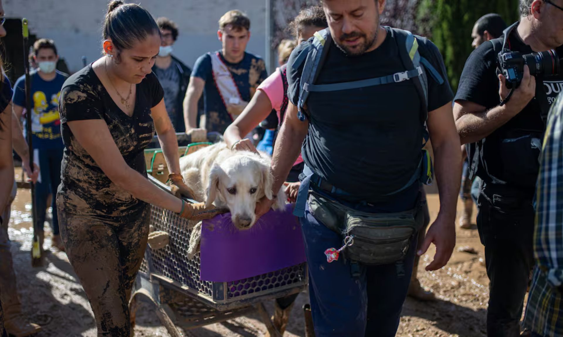 FOTO: Volun­ta­rios lle­van a un perro en Mas­sa­nas­sa (Valen­cia). Lore­na Sopê­na (Euro­pa Press).
