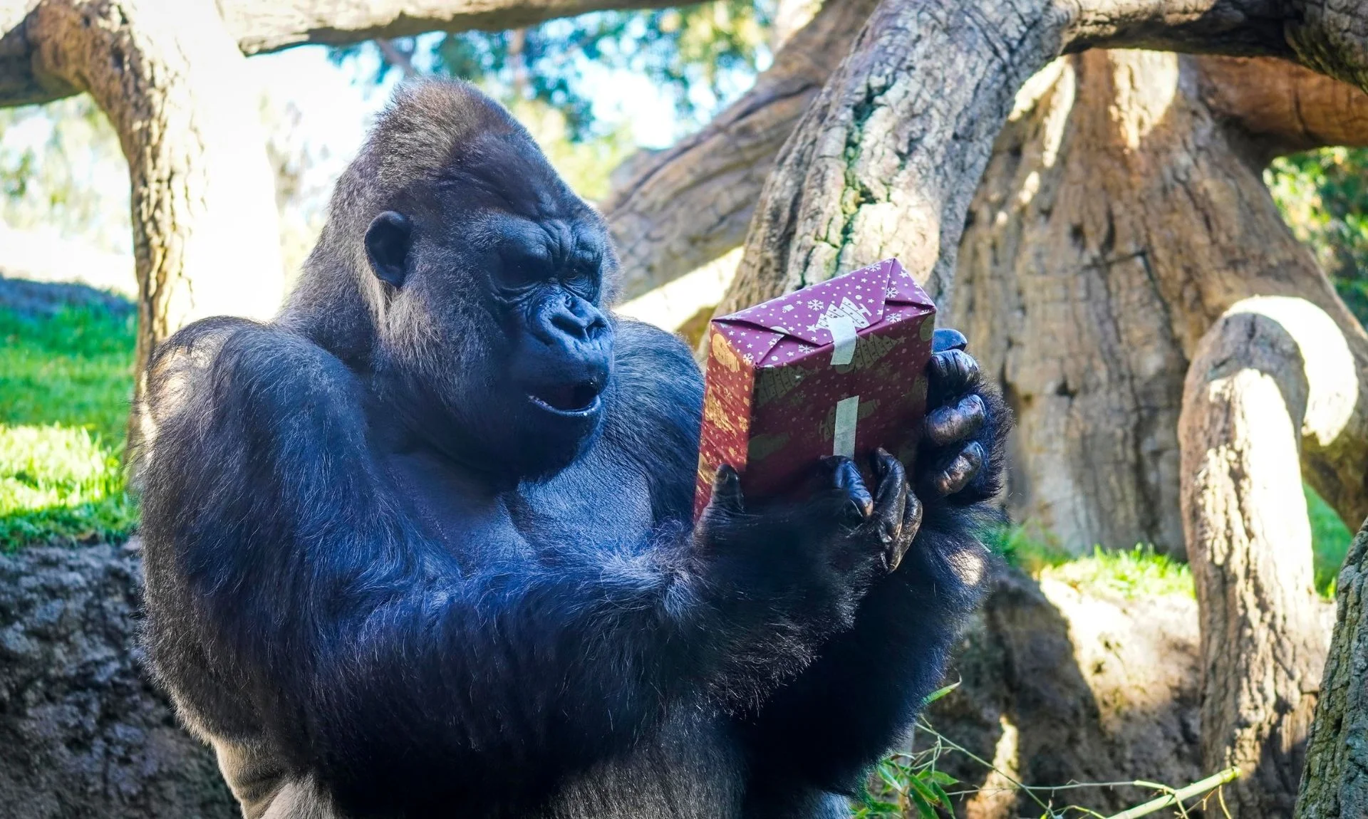 Los instantes más emotivos se han vivido con las sorpresas que el equipo de cuidado animal había preparado para las crías de elefantes y gorilas. Ha resultado realmente interesante ver la reacción del animal terrestre más grande que existe, el elefante africano. Makena y Malik, las dos crías de 2 años y 9 meses respectivamente, se lo han pasado en grande destapando los regalos y jugando sin parar con todo lo que encontraban. La manada de hembras igualmente ha aprovechado para degustar las delicatessen que encontraban con su eficaz trompa.