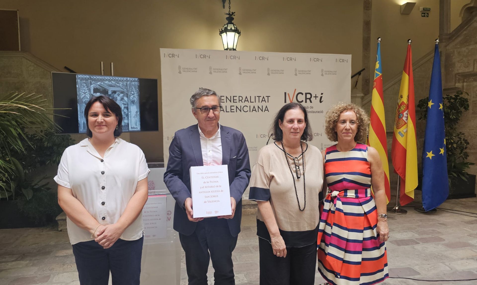 El conseller de Educación, Cultura, Universidades y Empleo, José Antonio Rovira, ha asistido a la presentación del libro «Una obra para la memoria cívica. El Centenar de la Ploma y el retablo de la antigua iglesia de San Jorge de València. Conservación, Restauración e Investigación», en el que se recogen los últimos estudios históricos, artísticos y de restauración sobre este emblemático retablo valenciano. Las coordinadoras de la publicación son la directora del Institut Valencià de Conservació, Restauració i Investigació (IVCR+i), Gemma Contreras, y la profesora de la Universitat de València, Encarna Montero.