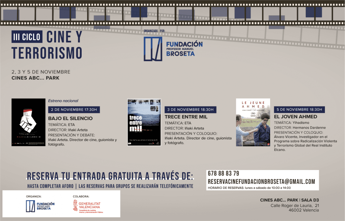 La Fundación Profesor Manuel Broseta, en colaboración con la Conselleria de Justicia, Interior y Administración Pública, inicia el III Ciclo de “Cine y terrorismo” que se celebrará en tres sesiones gratuitas los próximos 2, 3 y 5 noviembre en los Cines ABC Park de Valencia y que, por primera vez, se podrán seguir también en streaming.