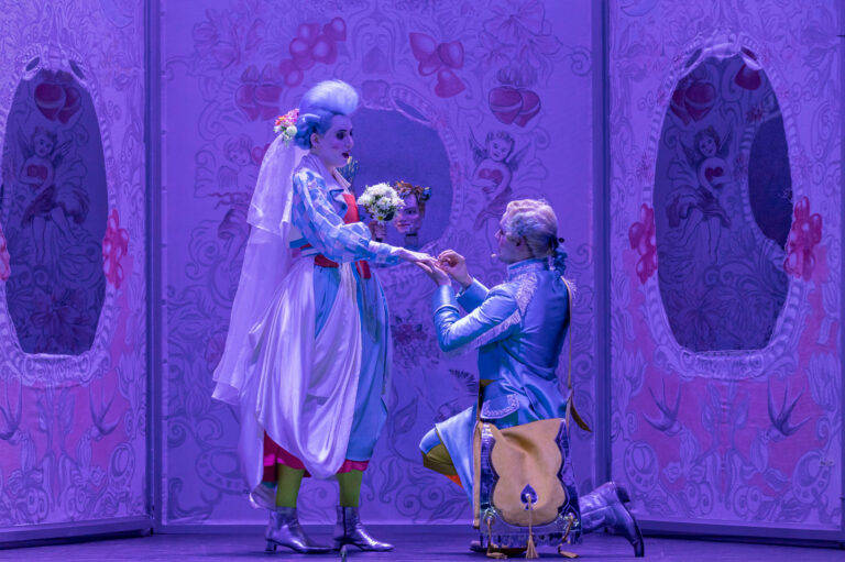 Para este espec­tácu­lo, Enedi­na Llo­ris ha adap­ta­do al valen­ciano el libre­to de la pri­me­ra ópe­ra de Mar­tín i Soler, que se repre­sen­ta en una nue­va pro­duc­ción de Les Arts con direc­ción de esce­na de Jau­me Poli­car­po. El mon­ta­je recrea el espí­ri­tu fres­co, lige­ro y diver­ti­do del joven Mar­tín i Soler con una esté­ti­ca ins­pi­ra­da en las tar­je­tas pos­ta­les román­ti­cas del siglo XIX, de colo­res tenues y pas­tel.