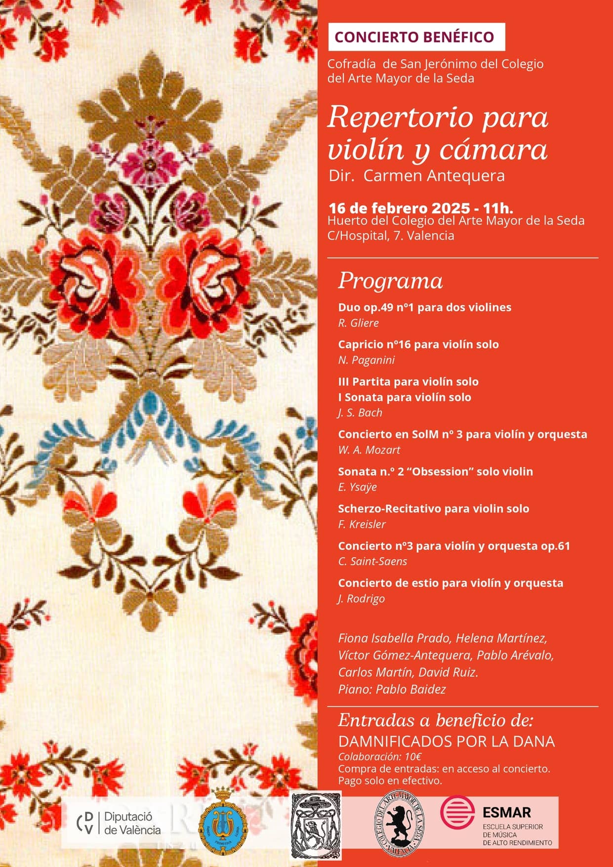 La Cofradía de San Jerónimo del Colegio del Arte Mayor de la Seda, en colaboración con la Escuela Superior de Música de Alto Rendimiento (ESMAR) y el Ateneu Musical d’Ensenyament Banda Primitiva de Llíria presentan un nuevo concierto que tendrá lugar el próximo domingo 16 de febrero. Un “Repertorio para violín y cámara”, dirigido por Carmen Antequera.