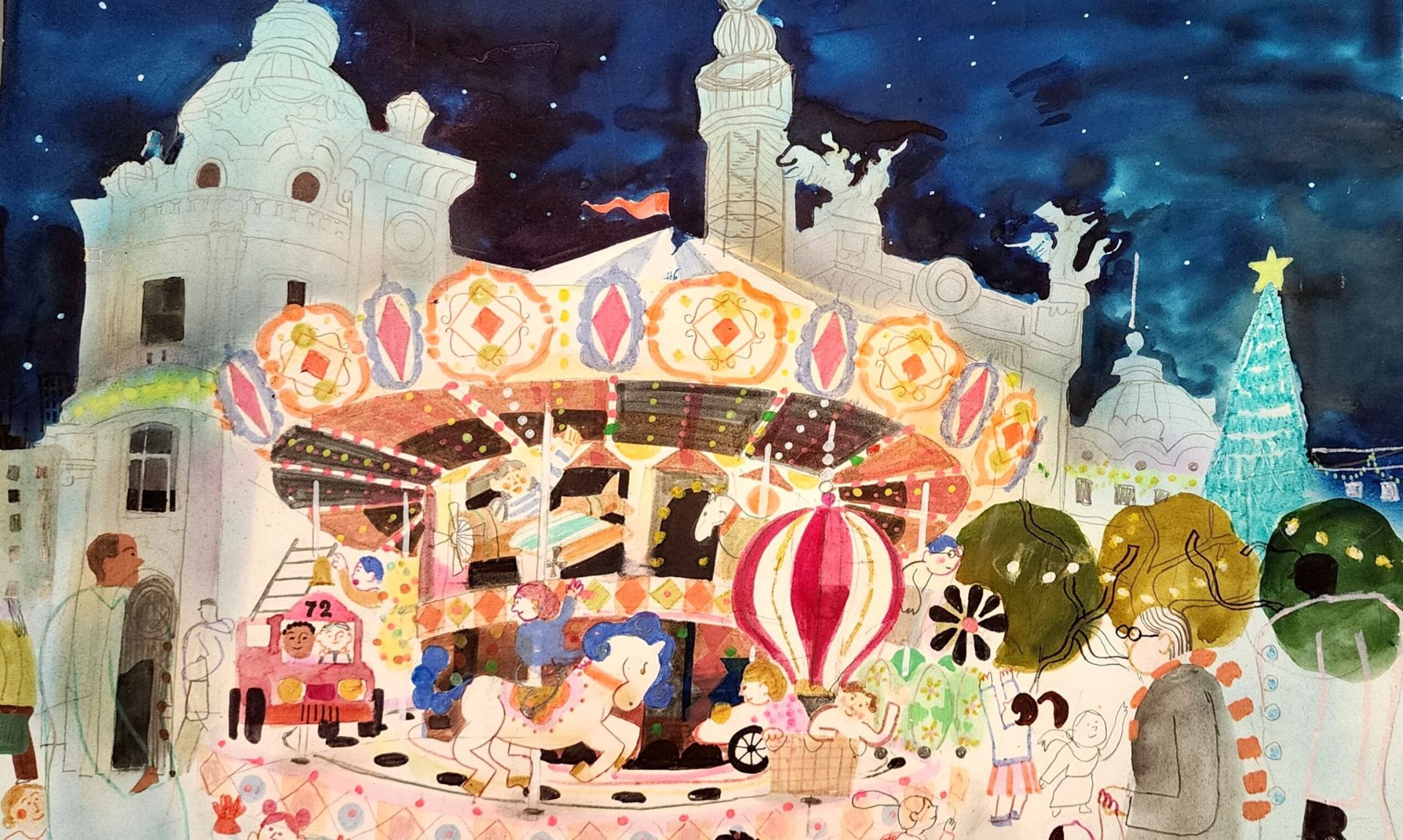 Víc­tor Visa repre­sen­ta los espa­cios comu­nes de los que se adue­ñan todos aque­llos que habi­tan la ciu­dad, ya sea duran­te toda la vida o por tan solo unas horas. Para mate­ria­li­zar esta visión, el artis­ta emplea un esti­lo que ya lo carac­te­ri­za entre la pin­tu­ra y la ilus­tra­ción.