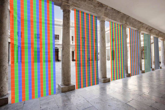 A la vez, en la primera planta del patio, se exhibirán tres grandes mosaicos (de 3m x 3m). A partir de la ampliación de la obra de Tiépolo “Joven con mandolina” se mostrará la imagen con diferentes resoluciones de cuadrícula. Todo ello animará al visitante a adentrarse en la naturaleza del color, y a visitar la exposición “Parejas de Tiépolo”, instalada en la sala Martínez Guerricabeitia.