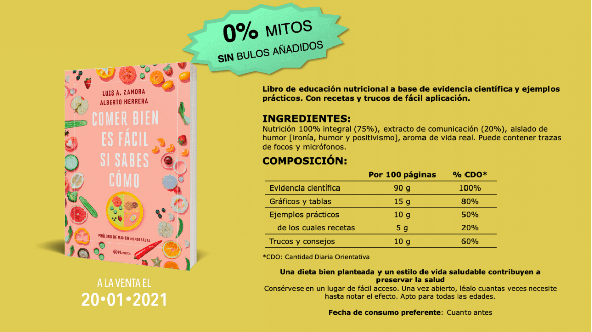 El dietista-nutricionista y comunicador Luis A. Zamora y el periodista Alberto Herrera se unen para escribir Comer bien es fácil si sabes cómo, editado por Planeta. Una obra fundamental que nos ayudará a coger las riendas de nuestra alimentación siguiendo las pautas y consejos que nos ofrecen. No importa dónde nos encontremos, ya sea en casa, en un restaurante o en la oficina, la opción más saludable del menú, la que más nutrientes nos aporte, debe ser siempre la primera de nuestra lista.