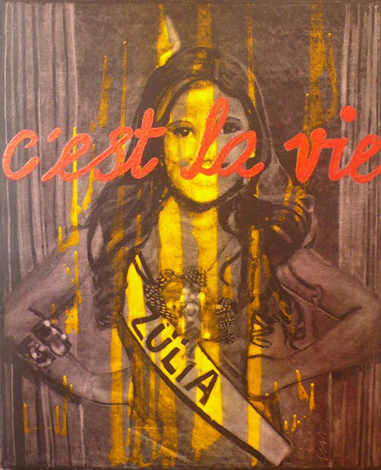La artista se toma la pintura sin duda como un manifiesto sin una respuesta evidente, donde sugiere y evoca su búsqueda hacia nuevos discursos plásticos. Lenguaje con manchas abstractas forman parte de su nuevo discurso pictórico sin renunciar a su contenido.
