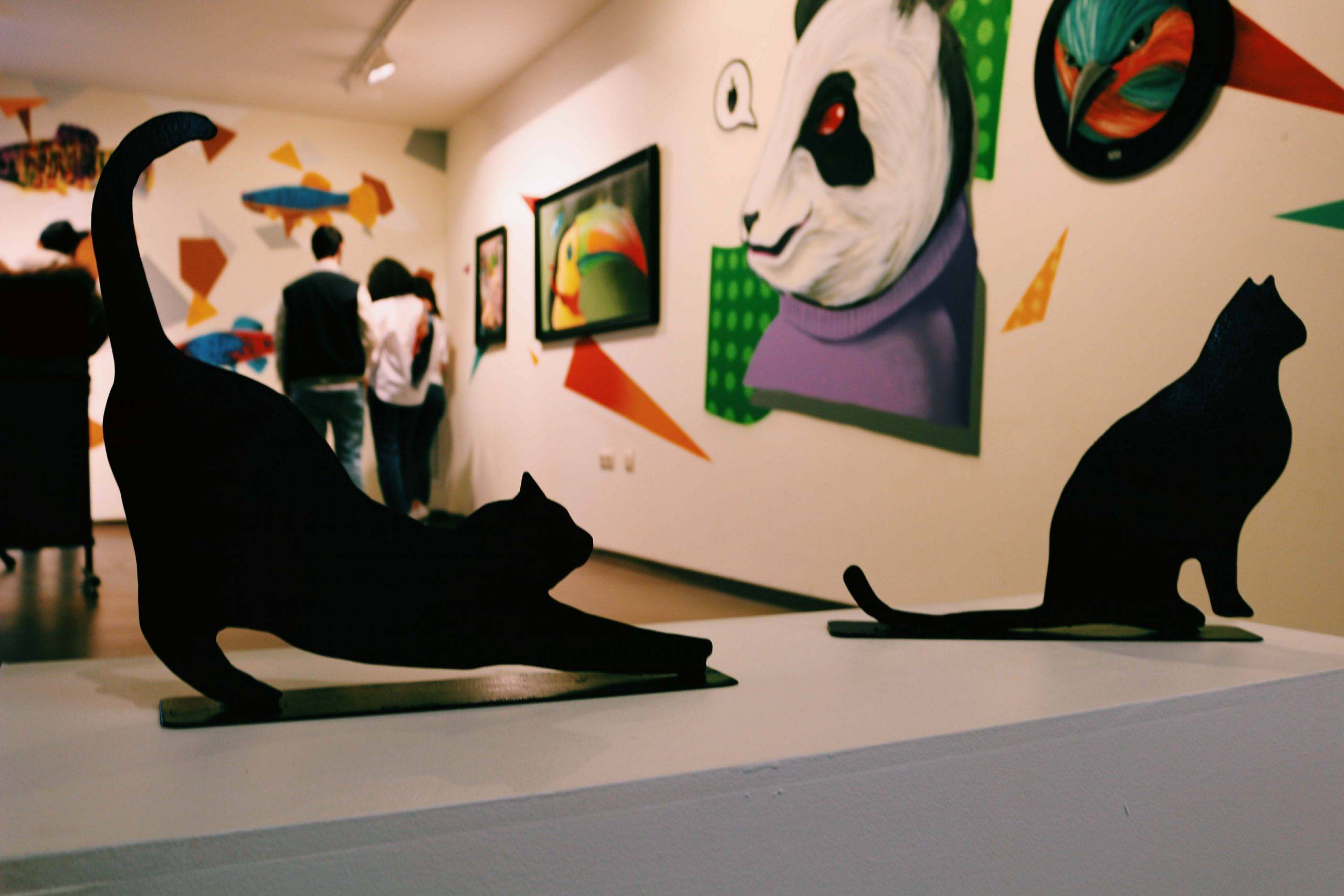 Una vis­ta de la sala con los gatos de Julia Lool, el mural de Fre­ca­les y Arte­na­ti­vos al fon­do.