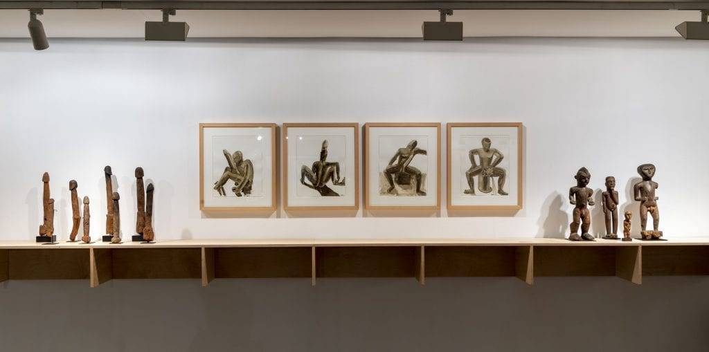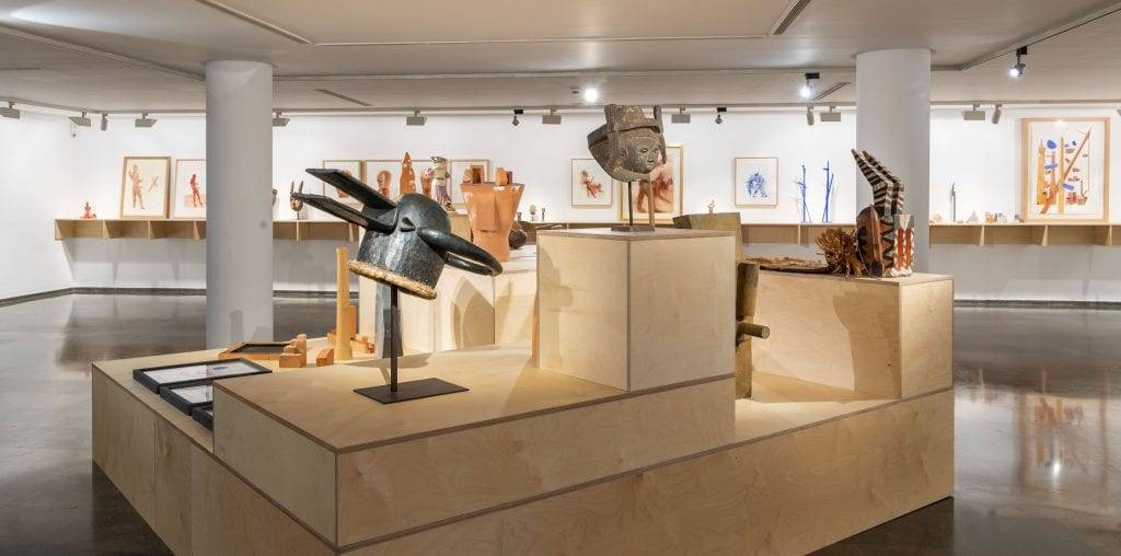 A lo largo de la exposición máscaras y fetiches africanos, objetos arqueológicos, juguetes, molduras barrocas y cactus de las colecciones privadas de Miquel Navarro conviven con algunos de los bocetos, acuarelas y terracotas del artista que se conservan en el IVAM, “recuperando el lugar del que vinieron”, ha apostillado el comisario.