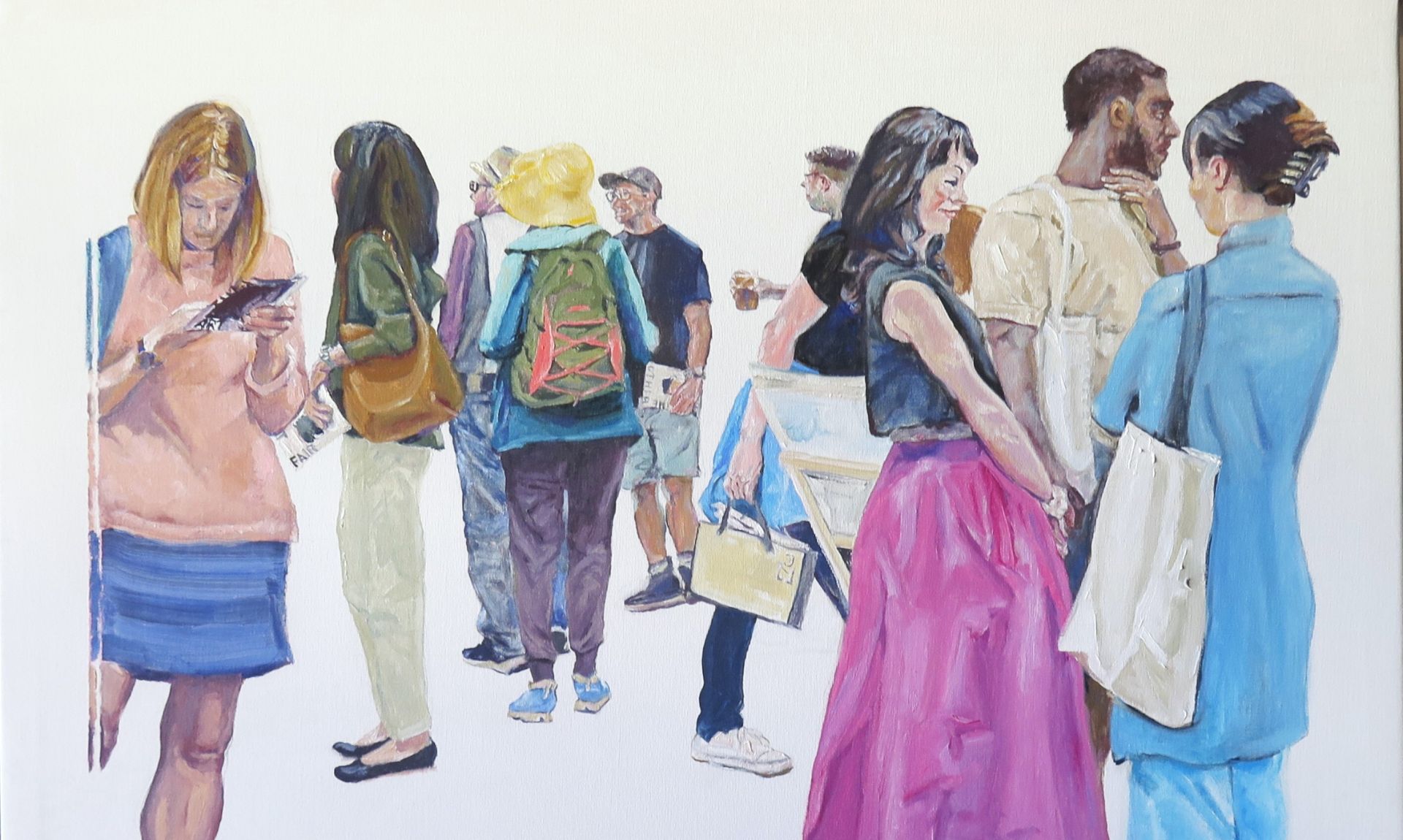 Ese mismo vacío lechoso comparece en la obra que Jesús Manuel Moreno reúne bajo el título de ‘La Línea Blanca’, quien utiliza la pintura de una forma contemporánea para recrear la vida en la calle de unos seres anónimos instalados en una misma realidad blanquecina. Con una notable diferencia: que mientras en ‘Matrix’ Neo muestra su asombro por el desvanecimiento de una realidad que él creía firme, en la obra pictórica que ahora nos ocupa, los sujetos que la protagonizan parecen adaptados a esa realidad evanescente.