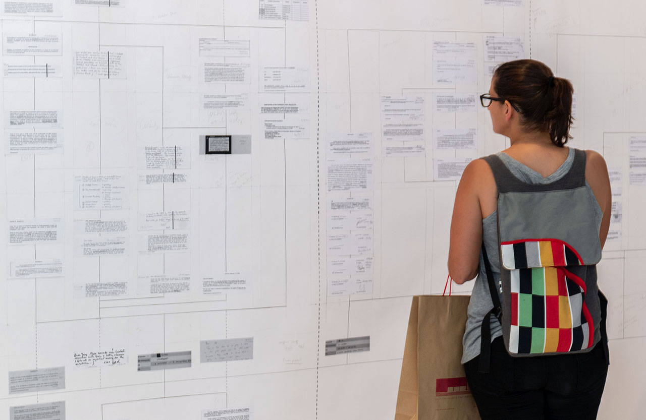 Según la comisaria de la muestra, Sandra Moros, “la sala inferior se ha convertido en una excavación arqueológica, con sus diferentes colores y texturas, dejando visible las huellas del tiempo pasado”. El proyecto avanza en la segunda planta, donde las artistas han adoptado la Matriz Harris, una metodología de trabajo usada en arqueología para representar las relaciones estratigráficas que se van identificando en un yacimiento arqueológico, con el fin de organizar los documentos que les han servido para profundizar en la memoria de las exposiciones organizadas en la Galería 6: correos electrónicos, facturas, cartas, notas de prensa… “Esas secuencias pueden leerse de forma horizontal o vertical. La línea horizontal comienza en 1986 con las escrituras de donación de la coleccion de Ignacio Pinazo al IVAM y llega hasta el año 2018, con la muestra más reciente realizada por el artista Federico Guzmán. La línea vertical recopila documentación de cada una de las 69 exposiciones que ha acogido la Galería 6″, ha explicado Patricia Gómez sobre la metodología de trabajo.