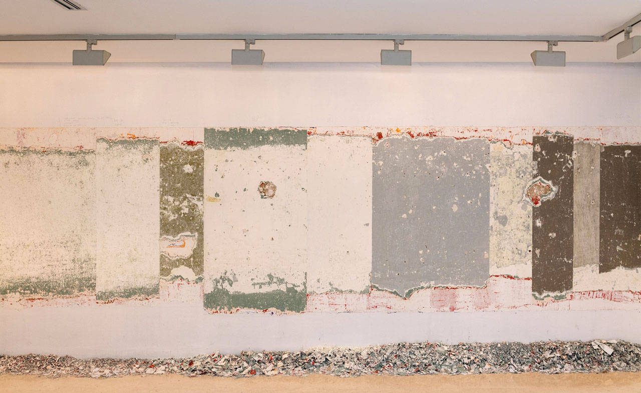 El título de la muestra, Hasta cota de afección, hace referencia al término arqueológico que marca el límite hasta donde se puede excavar. En este caso las artistas, ayudadas por un equipo de restauradoras, han extraído hasta ocho milímetros de capas de pintura de las paredes de la Galería 6 “en las que hemos identificado 69 exposiciones en 20 estratos, correspondientes a los 29 años de vida del IVAM”, explica Mª Jesús González.
