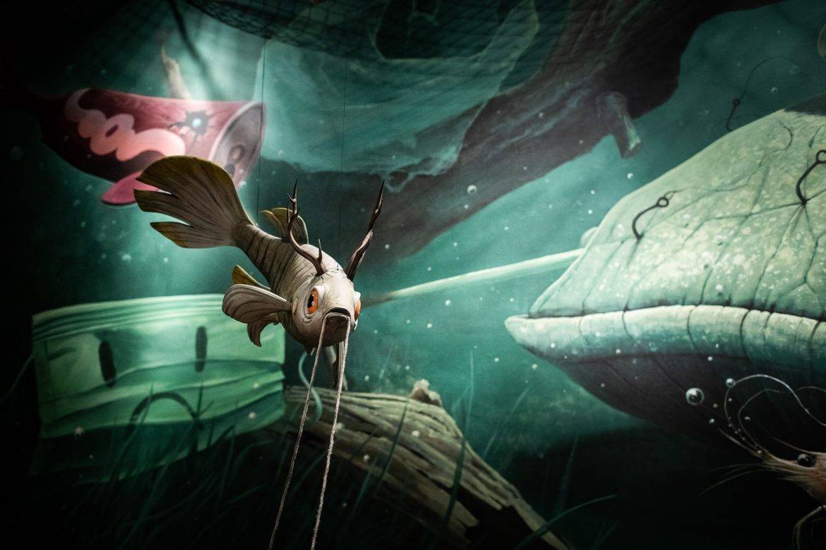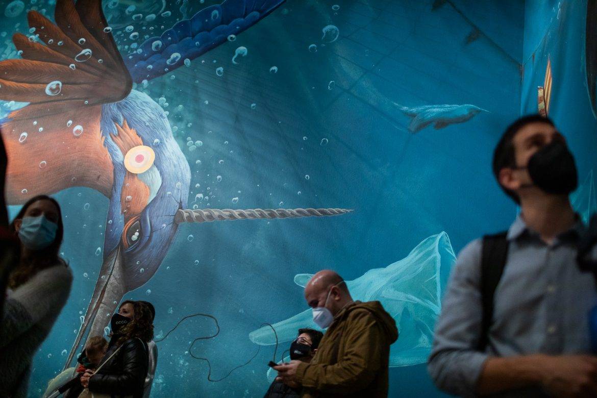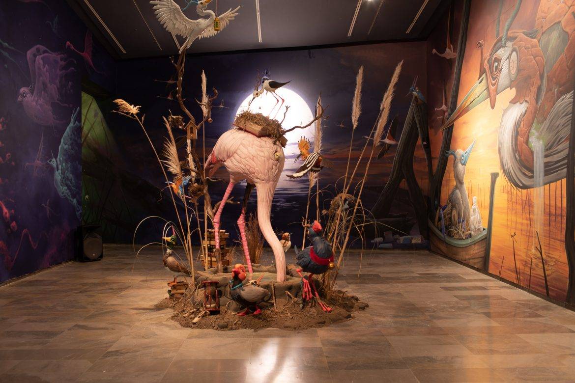 Viajamos al fondo de la pequeña porción de agua de la primera instalación, donde encontramos el flamenco con su cabeza sumergida en busca de comida. Junto a él, y sumergidos en una sala totalmente transformada en el fondo de la laguna, buscan sustento una pareja de “samarucs”, peces típicos de L’Albufera. Una mágica escena bajo un techo con restos de redes y plásticos que amenazan la pequeña porción de la reserva. Todas las paredes de la sala están intervenidas con una increíble transición de fondos acuáticos y personajes que luchan por la adaptación ante la extinción.