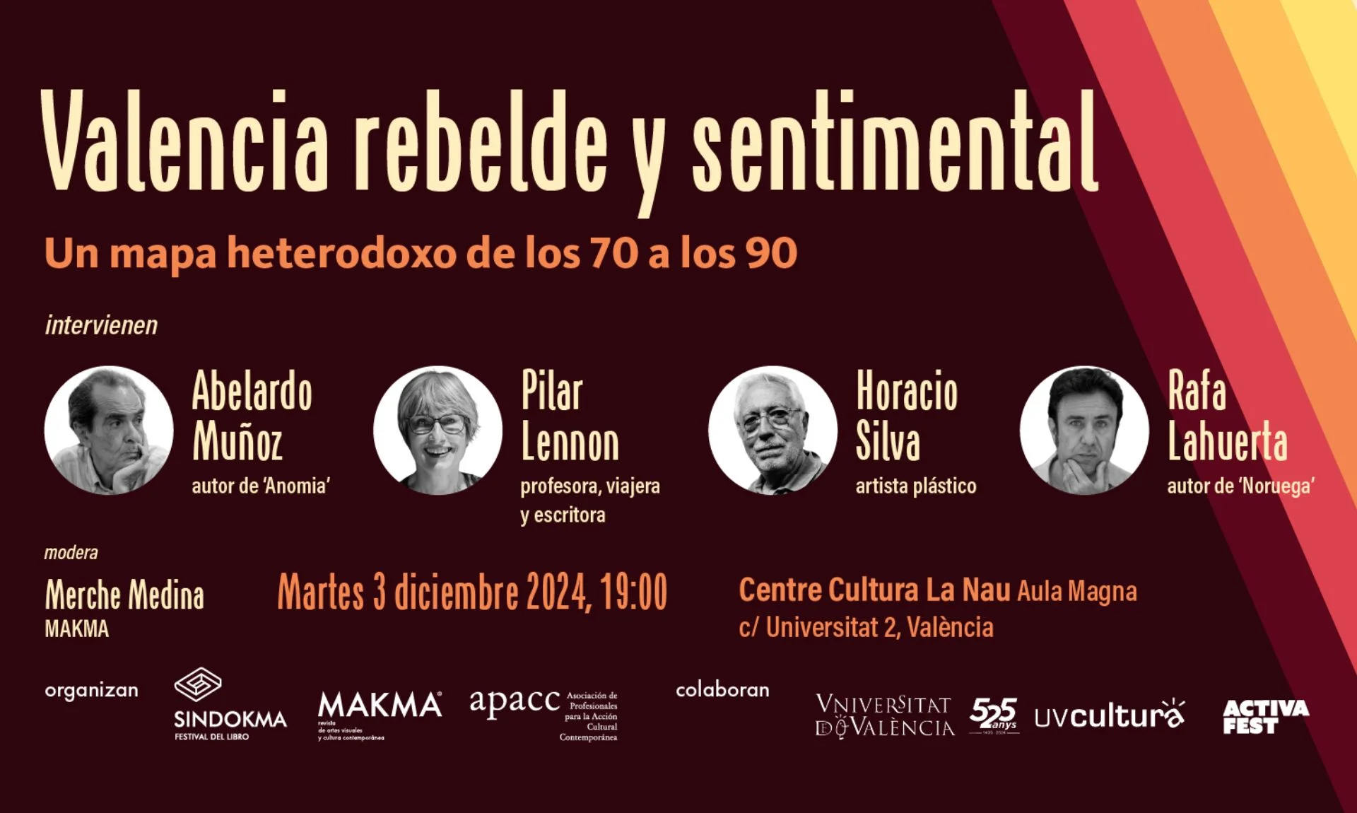 Huellas periodísticas y literarias que Aberlardo Muñoz y Rafa Lahuerta pisarán, de nuevo, en “Valencia rebelde y sentimental. Un mapa heterodoxo de los 70 a los 90″, un diálogo abierto en canal que tendrá lugar en el Aula Magna del Centre Cultural La Nau el próximo martes 3 de diciembre, a las 19:00, en compañía de la profesora Pilar Lennon y del artista Horacio Silva.
