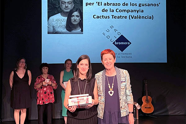 El segun­do es el Pre­mio al Mejor Tex­to, apa­dri­na­do por la Fun­da­ció Bro­me­ra, que este año ha sido para El abra­zo de los gusa­nos, fir­ma­do por Pau­la Llo­rens para la com­pa­ñía Cac­tus Tea­tre. Una emo­cio­nan­te pro­pues­ta con toques de humor que habla de la salud men­tal y de la amis­tad.