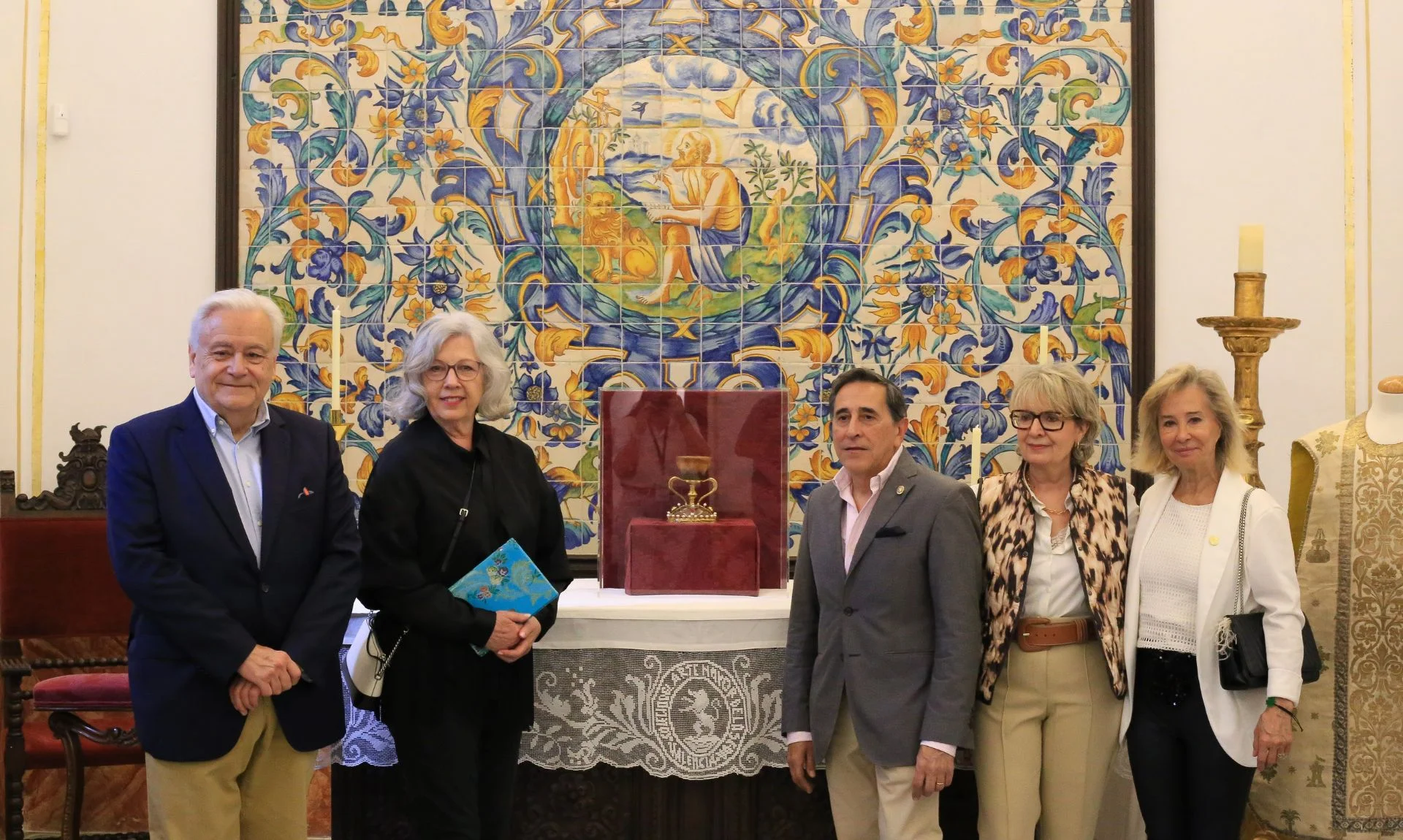 Fotografía: De izquierda a derecha. Don Alberto Catalá, vicepresidente del Colegio del Arte Mayor de la Seda; Doña Pilar Espona, comisaria de la exposición; Don Eduardo Puertes, presidente de la Cofradía de San Jerónimo del Colegio del Arte Mayor de la Seda, Doña Teresa González, secretario del Colegio del Arte Mayor de la Seda y Doña María Gómez, presidenta de la Fundación del Santo Cáliz.