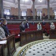 Los 33 concejales y concejalas han vuelto a estar presentes en el Hemiciclo, distribuidos entre las bancadas y los palcos para mantener la distancia de seguridad, gracias a la baja incidencia de la covid-19. La sesión ha empezado con un minuto de silencio en homenaje a las víctimas del terrorismo.