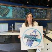 Eli­sa Valía con el car­tel que fomen­ta a Valen­cia como espa­cio­li­bre de bote­llas de un solo uso.
