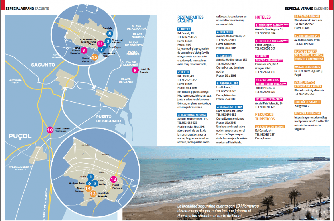 Sagunto, a menos de 30 kilómetros al norte de Valencia, es un destino ideal para el turismo de proximidad. Un lugar donde satisfacer todo tipo de gustos e inquietudes, desde la historia y la cultura más antiguas, con su castillo, teatro romano o su judería, hasta su época industrial, con sus naves e incluso la visita a uno de sus altos hornos, el número 2. Pero también destaca su gastronomía más actual y moderna, así como la naturaleza en rincones como la Marjal dels Moros (situado entre Sagunto y Puzol) o en sus 13 kilómetros de playas tanto urbanas como la del Puerto de Sagunto, como rústicas, como las playas de la Almardà o la Playa de Corinto e incluso cuenta con playas nudistas.