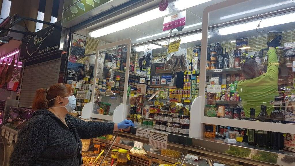 Agus­tín Mar­zal atien­de a una clien­ta des­de detrás de las mam­pa­ras de pro­tec­ción ins­ta­la­das en su pues­to