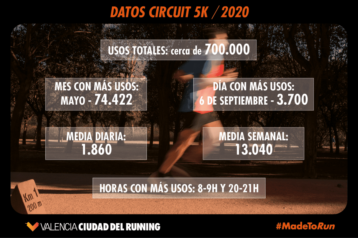 El número total de usos en este Circuit 5K rozará los 700.000 entrenamientos al final de este 2020, gracias al contador de usuarios que hay en uno de los puntos de paso de corredores. Aunque el número de personas, y lógicamente de sus entrenamientos, descendió drásticamente en la mitad del mes de marzo y, fundamentalmente, durante abril debido al confinamiento de la población en España, la vuelta en Valencia Ciudad del Running fue más intensa que en ningún otro sitio, alcanzando los 74.422 usos en mayo (2.480 usos/día), a partir del día 2, cuando se permitió volver a correr al aire libre.