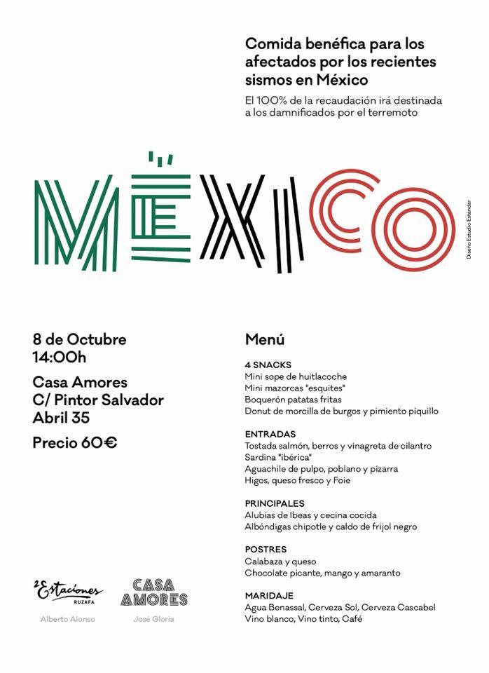 2 Estaciones y Casa Amores organizan una comida benéfica a favor de los damnificados por los temblores en México. Los dos restaurantes, Casa Amores y 2 Estaciones, ubicados en Ruzafa unen su talento para una buena causa: apoyar a los cientos de personas que han resultado afectadas por los terremotos en México. Ambos locales han ideado un cuidado menú que suma la exquisitez de la comida mexicana con deliciosas elaboraciones de la cocina española.