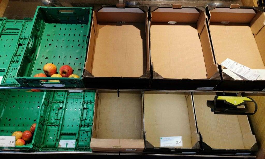 Cajas vacías en un super­mer­ca­do en Dort­mund, Ale­ma­nia, la sema­na pasa­da.