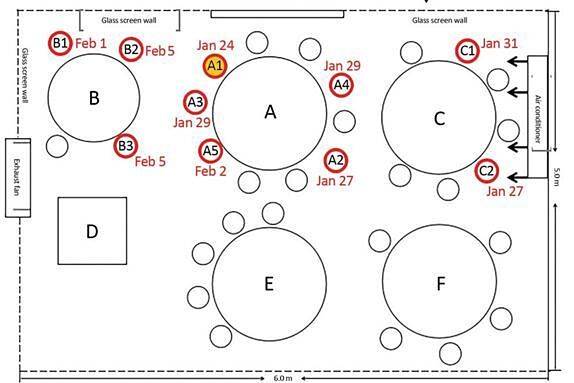 La mesa de la familia A estaba en el lado oeste del salón de 145 metros cuadrados. Además de la familia A, comían en ese momento la familia B y la familia C. La familia B y la familia A coincidieron durante un periodo de tiempo de 53 minutos y tres de sus miembros cayeron enfermos. La familia C estaba sentada cerca de la familia A en otra mesa larga en la misma zona y compartieron restaurante durante 73 minutos. Dos de los miembros de la C se contagiaron. Las mesas estaban a una distancia de un metro. Encima de la mesa de la familia C había un aparato de aire acondicionado que funcionaba soplando aire en dirección sur, atravesando las tres mesas. Parte del aire que salía del aparato rebotaba contra la pared volviendo de nuevo a la familia C.