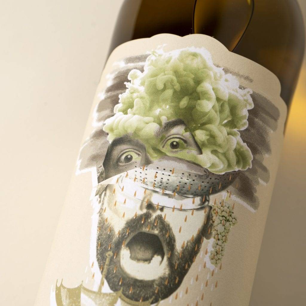 La etiqueta creativa “De Locos”, ya deja intuir la fuerza y frescura que conlleva el vino. ¿Hay algo más loco que llueva vino? Este collage artístico combina la uva, la lluvia y el vino como parte de un sueño onírico.