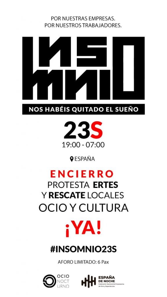 Denuncian que el Gobierno no haya cerrado aún ni las condiciones ni qué tipo de empresas del sector se beneficiarán de la ampliación de los ERTE. De este modo, y con el eslogan“INSOMNIO: Nos habéis quitado el sueño”, la protesta empezará a las 19:00 horas. con la lectura de un manifiesto en Radio City.