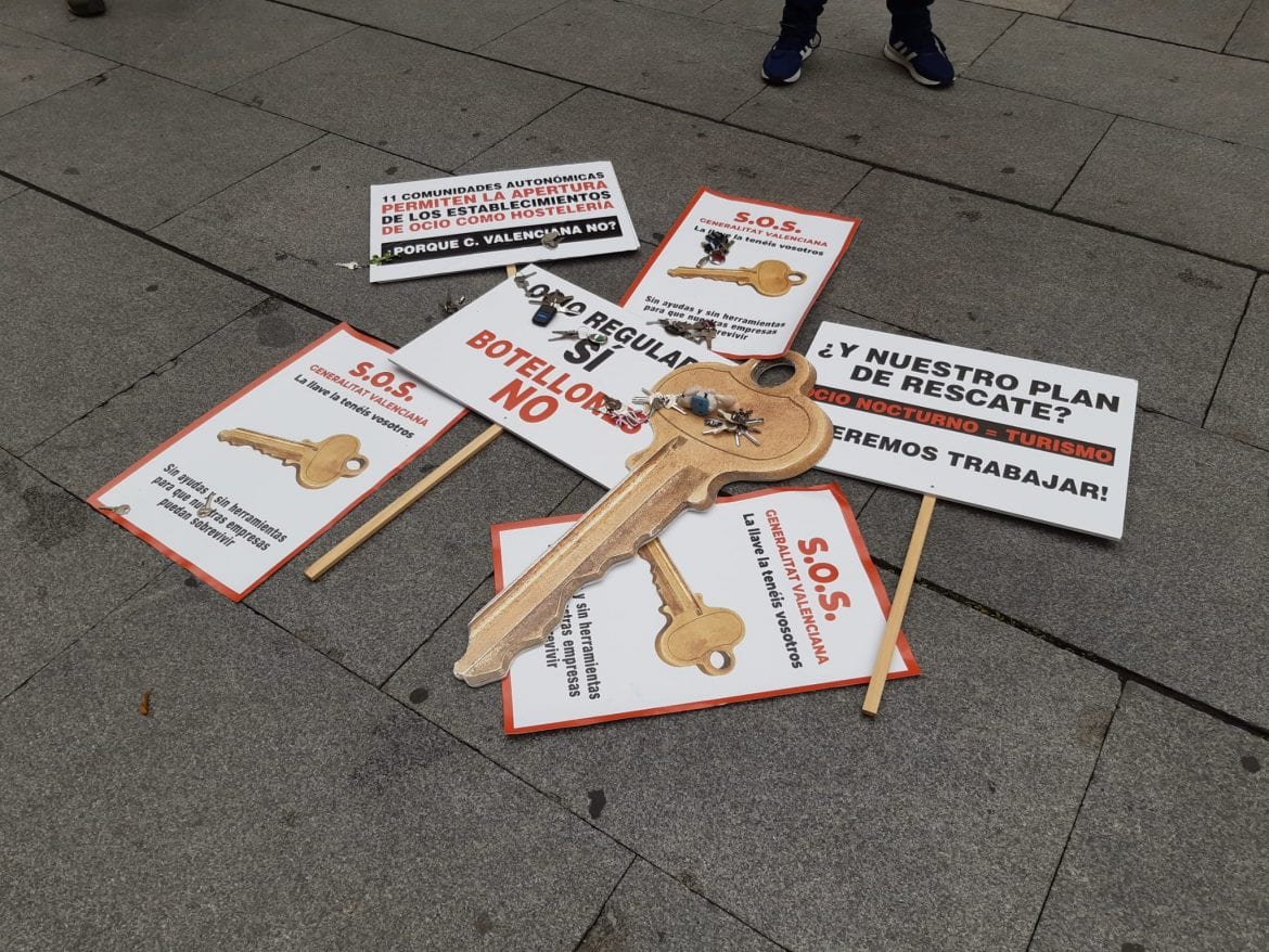 Con pancartas, bajo el mensaje principal “SOS Generalitat Valenciana: la llave la tenéis vosotros”, y un amontonamiento simbólico de llaves en el suelo, han puesto de manifiesto su “desesperación” ante el duro golpe económico y moral que está suponiendo para el sector la crisis sanitaria.