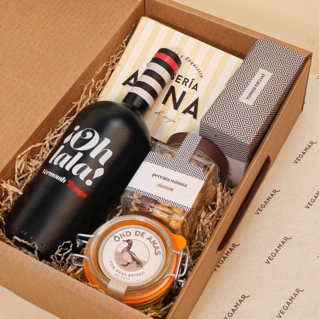Qué mejor que com­par­tir un ape­ri­ti­vo con tu per­so­na espe­cial y dis­fru­tar jun­tos de una copa de ver­mut rojo Vega­mar ¡Oh lala!, acom­pa­ña­do con que­so de Ove­ja 100% Ahu­ma­do de la Que­se­ría de Anna, el Foie Entier de pato Önd de Anas, una selec­ción pre­mium de fru­tos secos y lámi­nas de cúr­cu­ma Pec­ca­ta Minu­ta. Todos los packs se pue­den rega­lar, y per­so­na­li­zar con una tar­je­ta con men­sa­je.