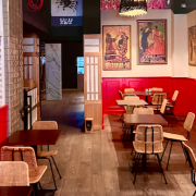 Su interiorismo, basado en los tópicos de la cultura española, reúne elementos tan representativos como pequeñas cabezas de toros rojas, carteles a tamaño real de históricas corridas, patas de jamón doradas colgadas del techo, y un sinfín de detalles “typical spanish” que componen el escenario perfecto para disfrutar de una experiencia única en pleno centro de la ciudad.