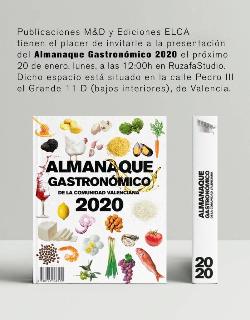 Publicaciones M&D y Ediciones ELCA presentan el Almanaque Gastronómico de la Comunidad Valenciana 2020. El acto tendrá lugar el próximo lunes, 20 de enero, a las 12 horas, en el espacio cultural Ruzafa Studio de Valencia (ubicado en la calle Pedro III el Grande, 11d, bajos interiores).