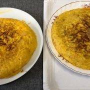 De pata­ta y cebo­lla: muy con­se­gui­da, pun­to are­no­sa, sua­ve y melo­sa. La cebo­lla endul­za y da untuo­si­dad al con­jun­to; aun­que coge algo más de acei­te, en boca resul­ta agra­da­ble, entra­da sutil, con bue­na uti­li­za­ción de cebo­lla en pro­por­ción con la can­ti­dad de pata­ta y hue­vo. Nada gra­sien­ta ni sala­da. Dul­zu­ra eter­na. Color ama­ri­llen­to con leves tona­li­da­des marrón cara­me­lo.