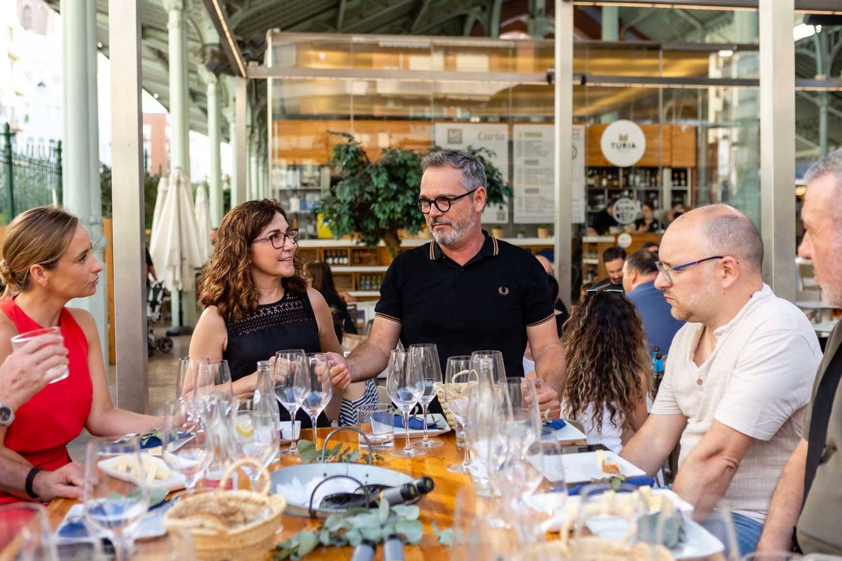 Un selecto grupo de periodistas gastronómicos y expertos en vino cató el miércoles, día 12 de julio, las añadas de 2021 y 2022 del vino Mestizaje Blanco de la Bodega Mustiguillo en el espacio Mi Cub del Mercado de Colón de Valencia. Una cata con maridaje que fue posible gracias a la colaboración con Voravins y en la que los asistentes probaron también excelentes productos como un queso Comté que combinaba a la perfección con el carácter más envolvente y suave de la añada de 2021 o una rosquilla de Ensaladilla Rusa y Sardina de Bota de Almamarina, que se sincronizaba con los toques más directos y ácidos de la añada de 2022.