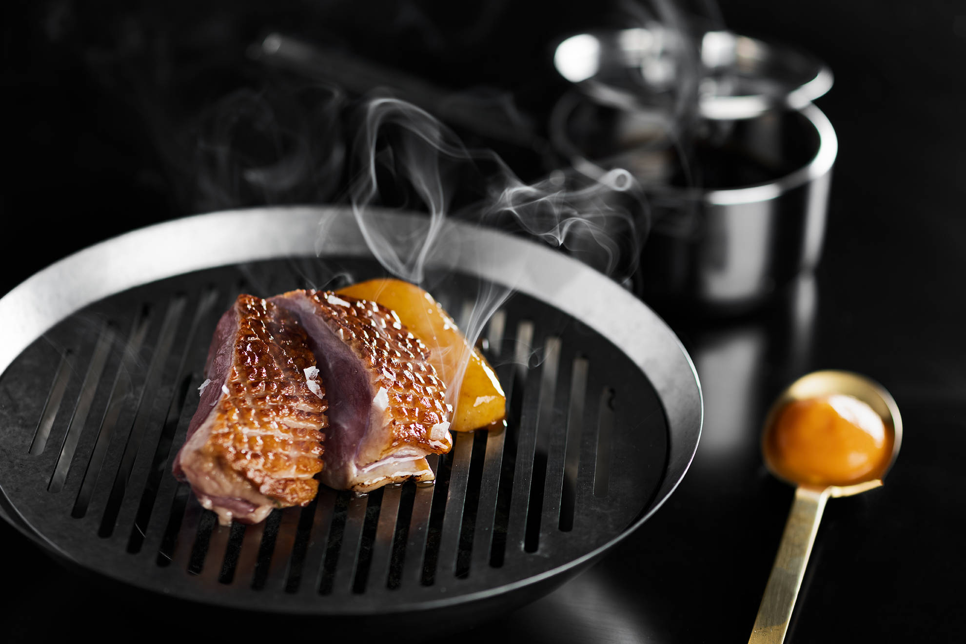 Pato a la brasa, pera a la vainilla y boniato rojo