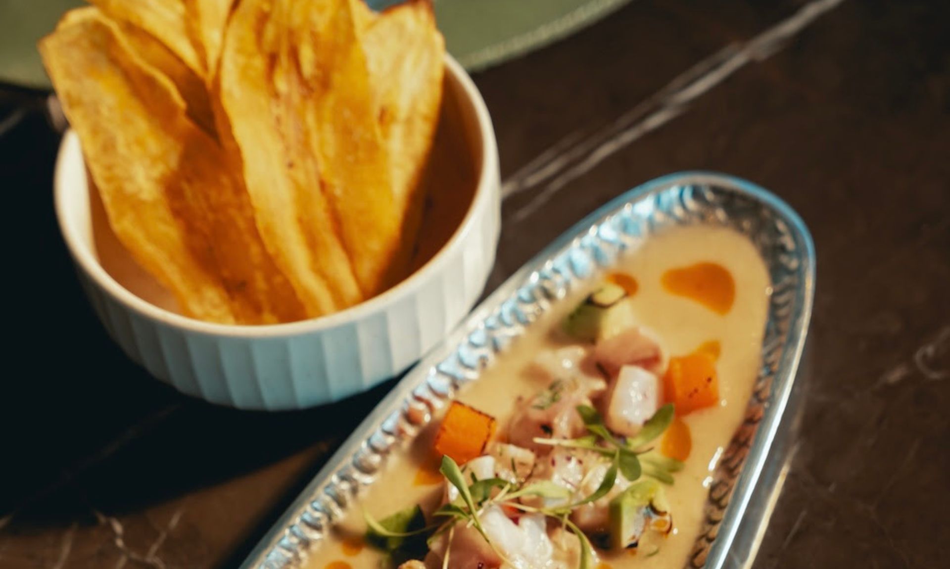 La pro­pues­ta refle­ja la filo­so­fía del res­tau­ran­te: una coci­na hones­ta y ambi­cio­sa don­de el pro­duc­to es el autén­ti­co pro­ta­go­nis­ta. El con­tras­te entre la sua­vi­dad del agua­ca­te, el dul­zor del bonia­to y la aci­dez vibran­te de la leche de tigre poten­cia la fres­cu­ra de la cor­vi­na, mien­tras que las chips de plá­tano fri­to apor­tan un toque cru­jien­te y adic­ti­vo que com­ple­ta la expe­rien­cia.