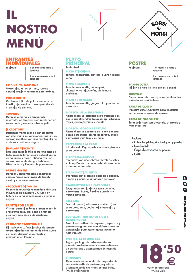 Los restaurantes Sorsi e Morsi ofrecen la mejor calidad en Sorsi (sorbos) y Morsi (mordiscos), todo elaborado según las recetas tradicionales italianas a las que añaden su especial toque contemporáneo. Platos auténticamente italianos también en Navidad, y por eso, para estas fechas, ofrecen un menú especial que te dará muchas opciones a la hora de elegir sitio para tus celebraciones.