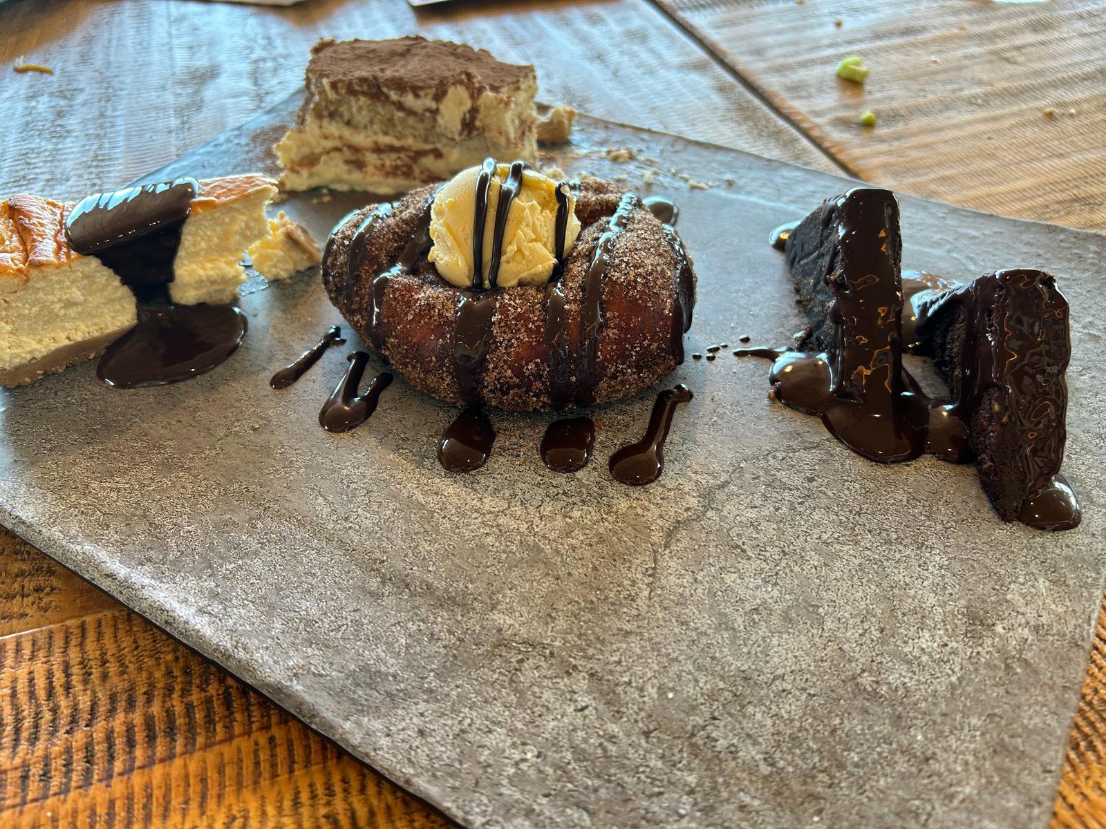 Entran­tes: bra­vas, buñue­li­tos de baca­lao con alio­li, pul­po a la plan­cha con pata­ta coci­da, par­men­tier de pimen­tón y refri­to valen­ciano, gaz­pa­cho.