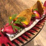 Empieza lo serio. Salmonete y cromatismo naranja, en realidad tres minilomos del pescado de roca más sabroso que apenas pasa por el fuego y compone junto a cuatro o cinco cremas. Una felicísima aunque corta recreación de la cocina japonesa con las posibilidades que los cítricos, las frutas y las verduras ofrecen a la hora de salsear.
