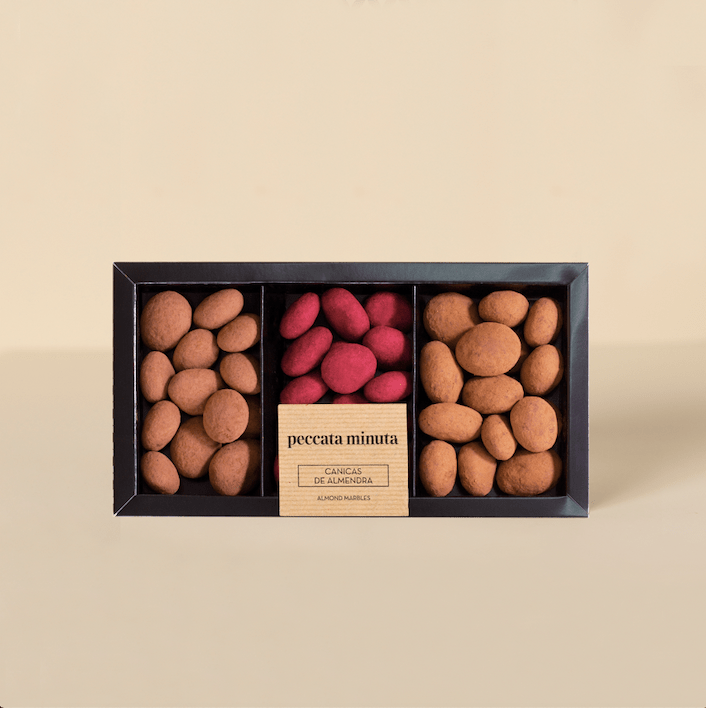 Otra de las propuestas estrella de Vegamar son sus Canicas de almendra 3 variedades Peccata Minuta. Almendra Marcona tostada y caramelizada con chocolate blanco envuelta en cacao en polvo, almendra Marcona tostada y caramelizada con chocolate blanco envuelta en frambuesa en polvo y por último, la de 80% de cacao, caramelizada y cubierta de cacao en polvo. Una opción especial y diferente para tus momentos más especiales.