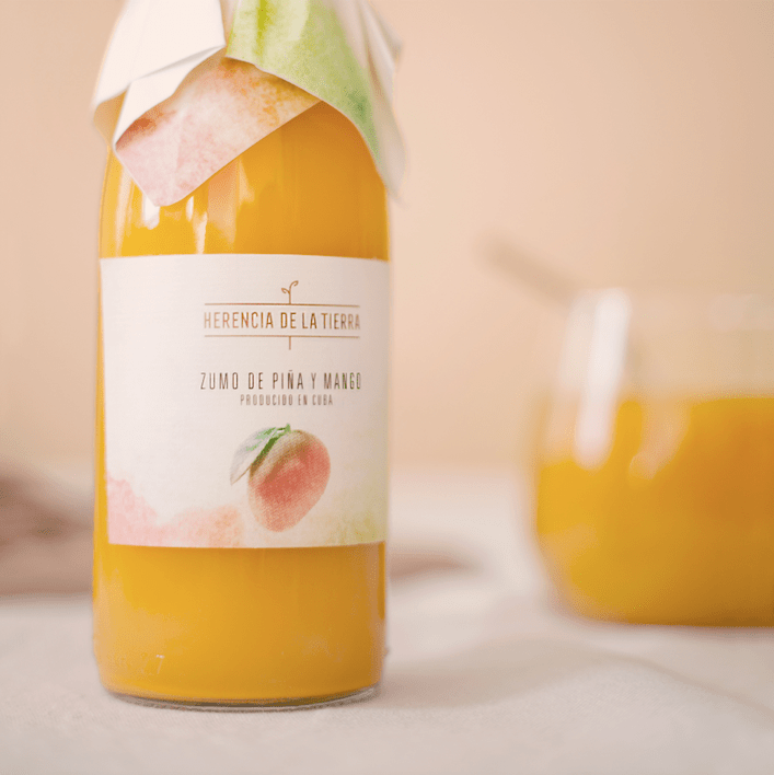 Elzumo de mango y piña Herencia de la Tierra está elaborado con frutas maduras seleccionadas, 100% natural sin azúcares añadidos, con un 30% de zumo de mango natural y 70% de zumo de piña natural. Producido en Cuba con extraordinario sabor, de textura suave y con aroma a fruta tropical.