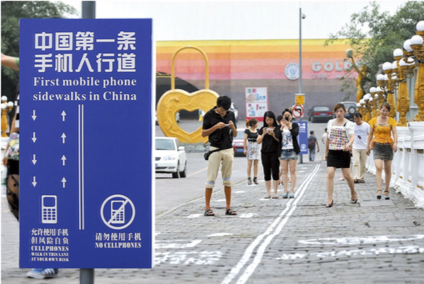 Calle de la ciu­dad de Chong­qing, en Chi­na, que tie­ne seña­li­za­dos carri­les exclu­si­vos para vian­dan­tes usua­rios de Smartpho­nes.