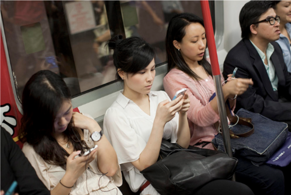 Usua­rias de smartpho­ne en el metro de Shan­gai.