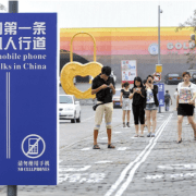 Calle de la ciu­dad de Chong­qing, en Chi­na, que tie­ne seña­li­za­dos carri­les exclu­si­vos para vian­dan­tes usua­rios de Smartpho­nes.