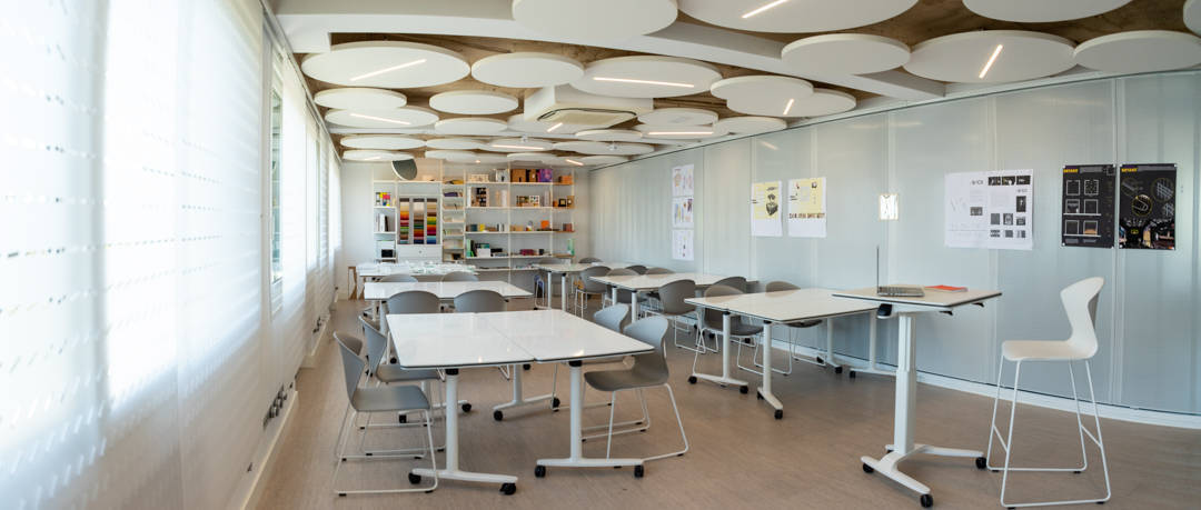 Pen­sa­da ini­cial­men­te para aco­ger a 40 estu­dian­tes, la ver­sa­ti­li­dad del mobi­lia­rio y la ampli­tud de las mesas ha per­mi­ti­do recon­fi­gu­rar el espa­cio para aco­ger a 20 alum­nos de mane­ra pre­sen­cial, cum­plien­do con todos los requi­si­tos de segu­ri­dad y dis­tan­cia social.