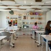 Pen­sa­da ini­cial­men­te para aco­ger a 40 estu­dian­tes, la ver­sa­ti­li­dad del mobi­lia­rio y la ampli­tud de las mesas ha per­mi­ti­do recon­fi­gu­rar el espa­cio para aco­ger a 20 alum­nos de mane­ra pre­sen­cial, cum­plien­do con todos los requi­si­tos de segu­ri­dad y dis­tan­cia social.
